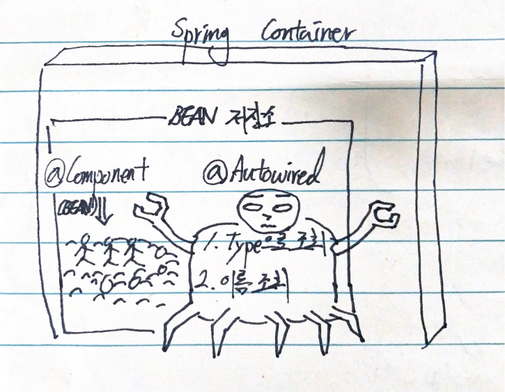 @Autowired를 지정하면 스프링 컨테이너가 자동으로 해당 스프링 빈을 찾아서 주입한다. (기본적으로 타입이 같은 빈을 찾는다. 같은 타입인 빈이 여러개인 경우 파라미터 명, 필드 명으로 찾는다)