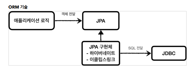ORM 기술 : 애플리케이션 로직→ 객체 전달 → JPA ←JPA 구현체 (하이버네이트 ,이클립스링크) → SQL 전달 → JDBC