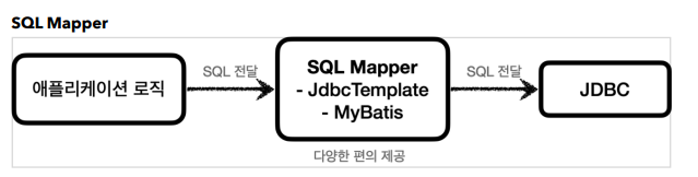 SQL Mapper : 애플리케이션 로직 → SQL 전달 → SQL Mapper(JdbcTemplate, MyBatis) → SQL 전달 → JDBC